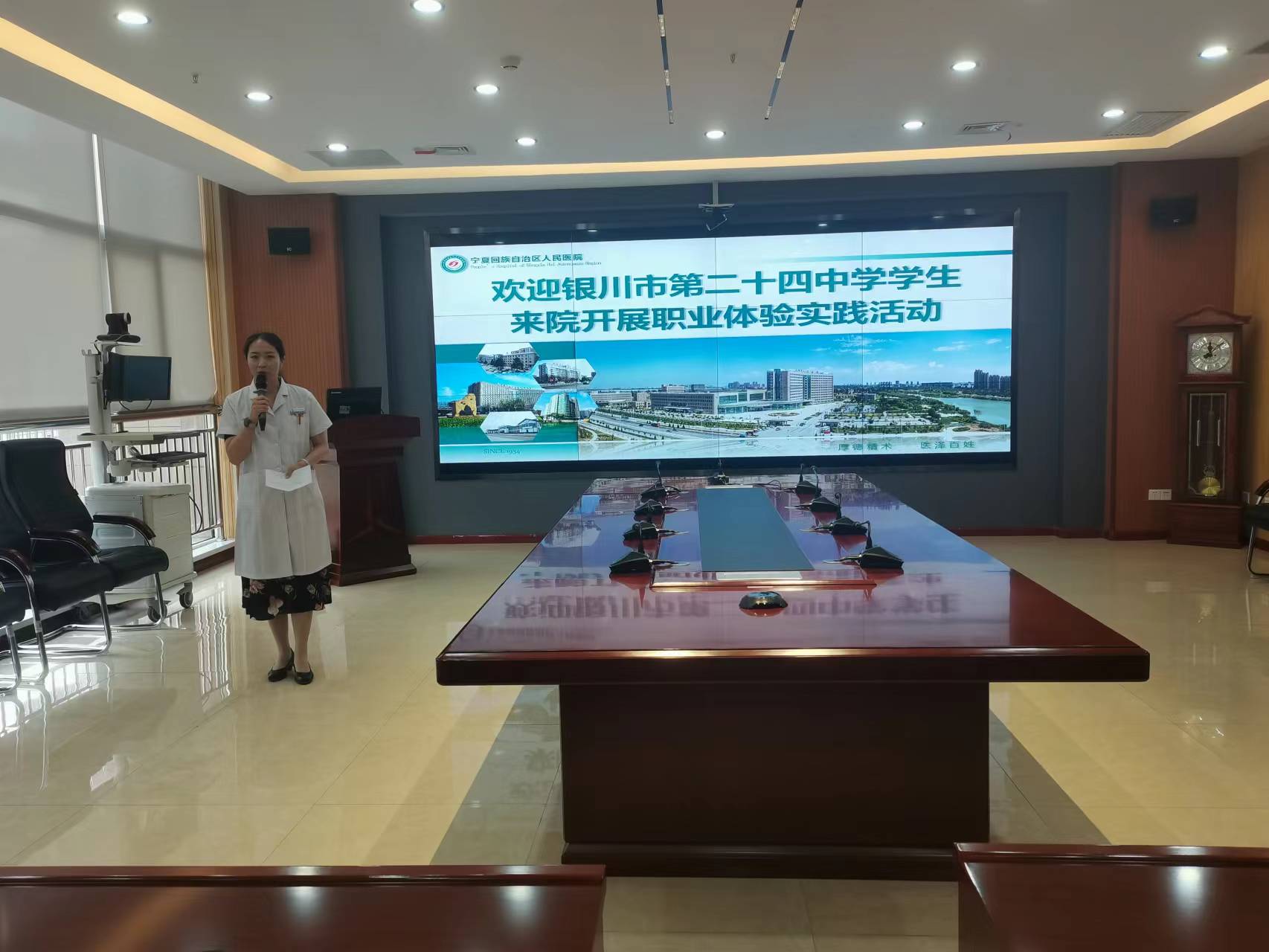 宁夏回族自治区人民医院西夏分院马锋院长对此次参加活动的我校师生表示热烈欢迎,马院长介绍了西夏分院的发展历史,医学职业的职业特性,医务人员救死扶伤的担当尽责和无私奉献精神,希望同学们通过今天的职业体验增进对医务人员工作的了解,根据自己的兴趣爱好选择未来的职业,并预祝活动取得圆满成功。