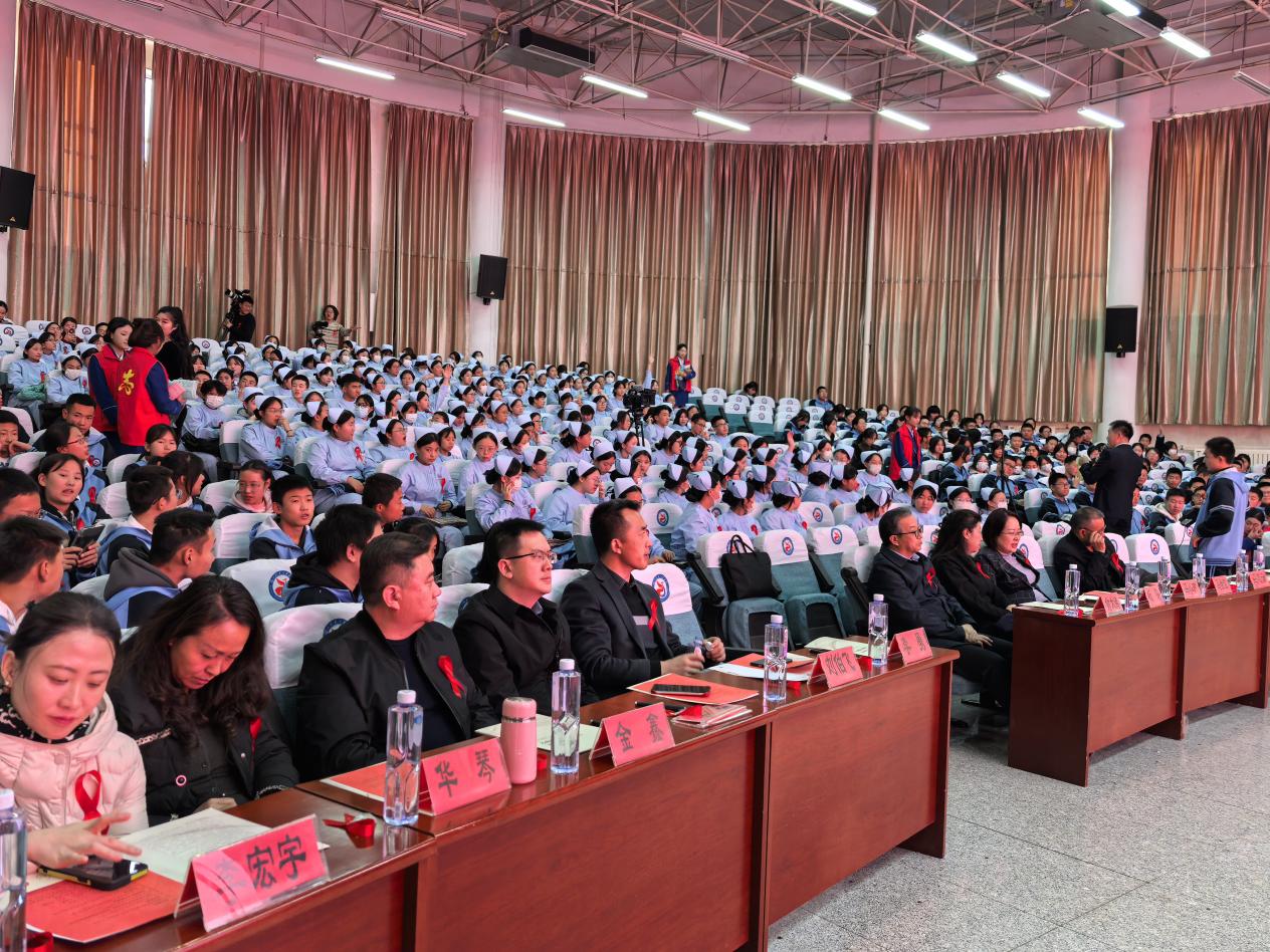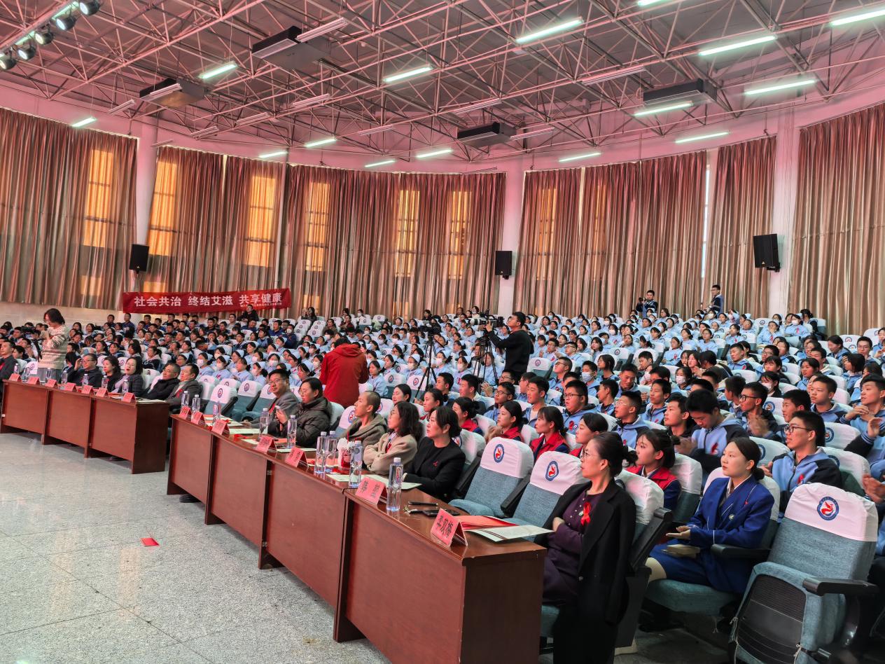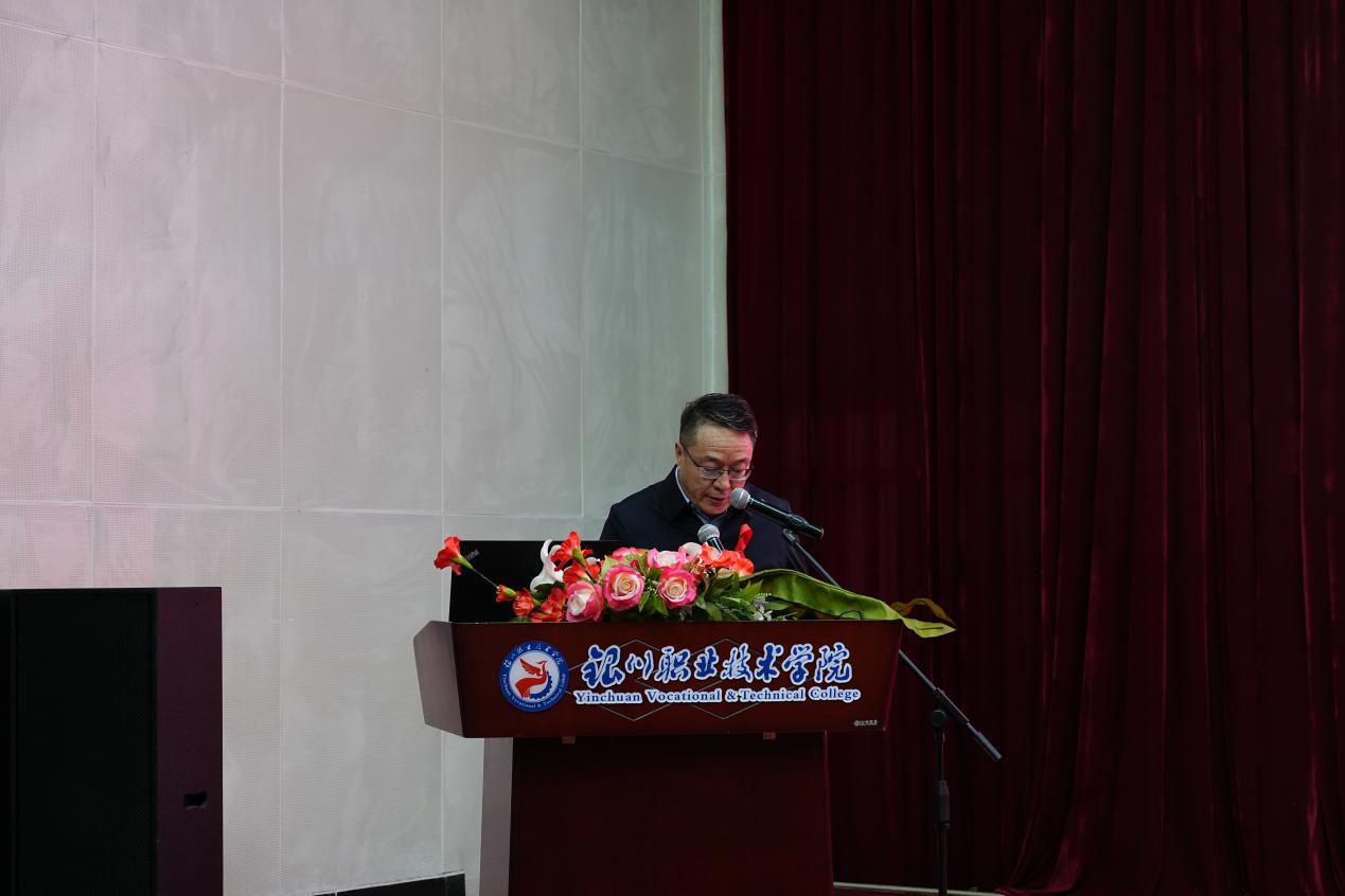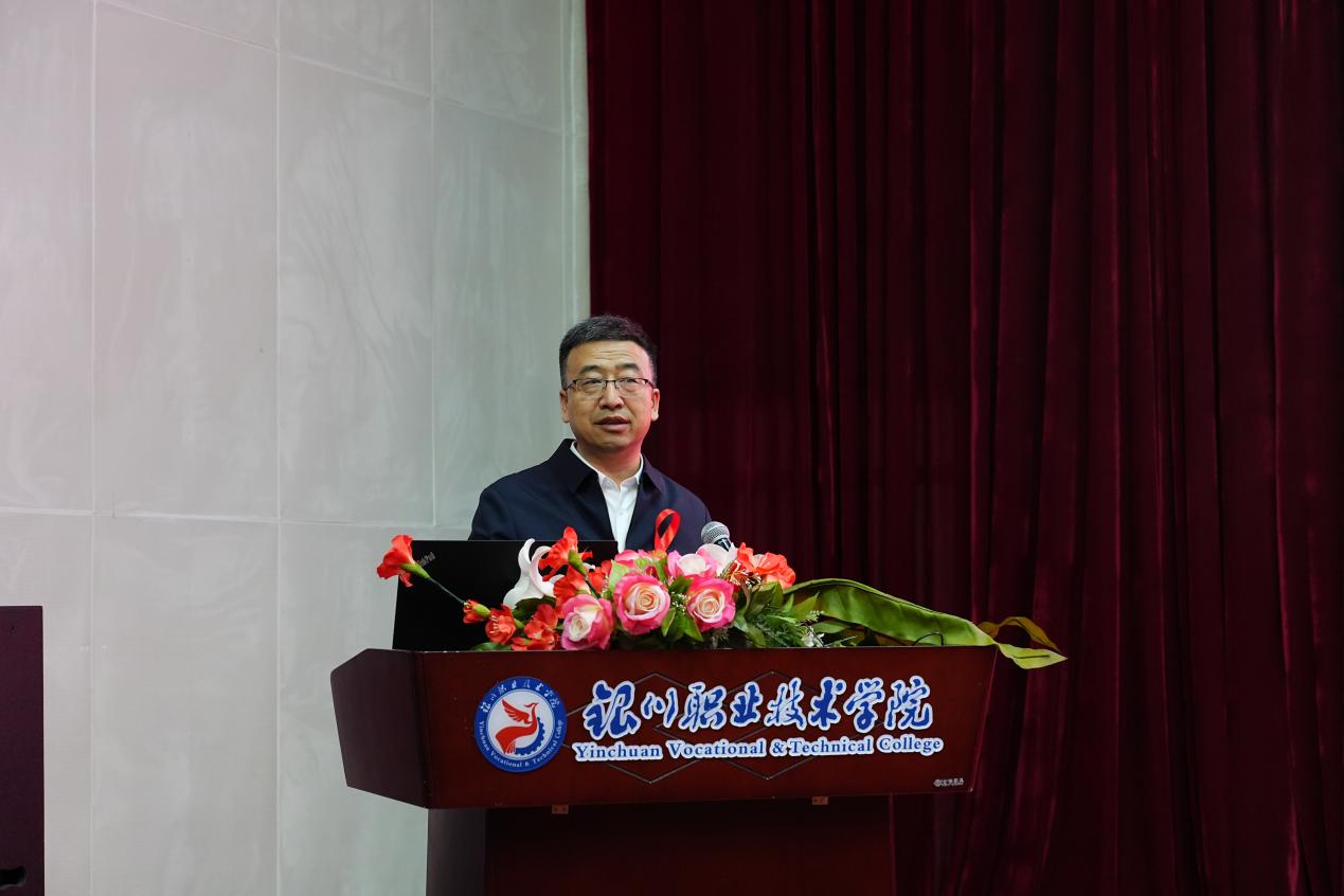 银川职业技术学院党委书记马亚宁发表讲话,呼吁全院师生,将知识转化为实际行动,不仅要做自己健康的第一责任人,更要成为艾滋病防治知识的传播者、倡导者。