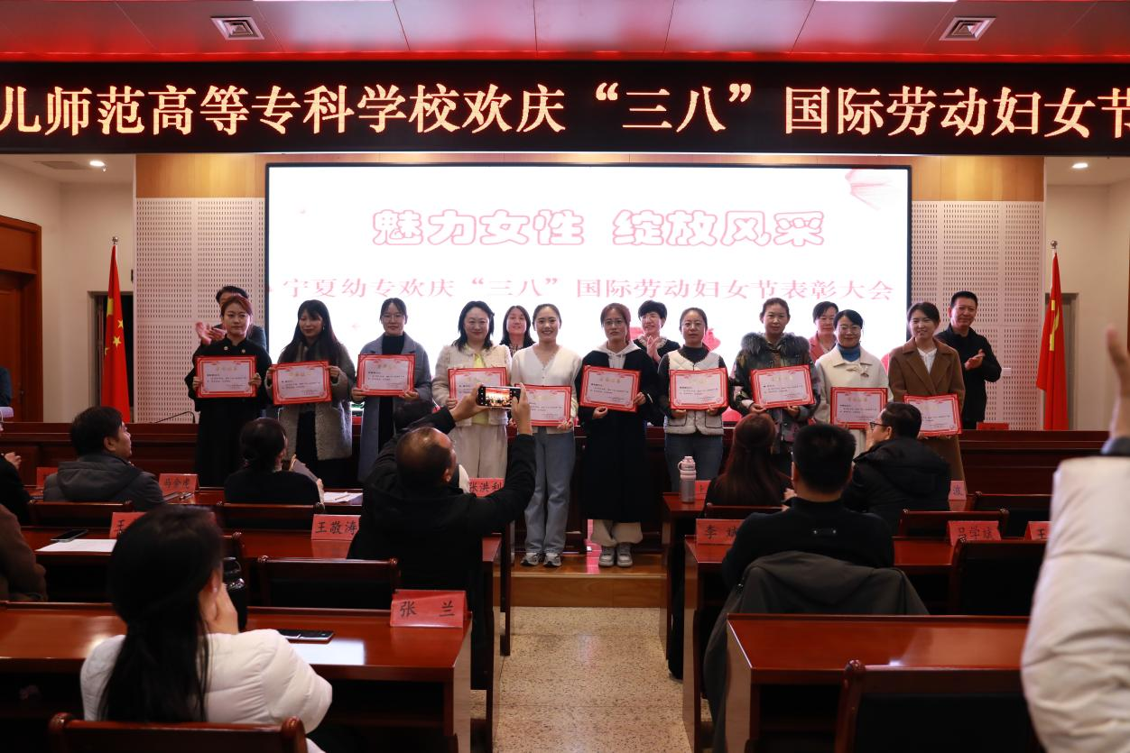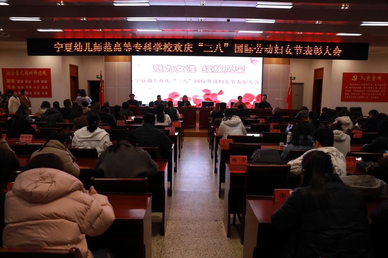 为庆祝第115个“三八”国际劳动妇女节,激励广大妇女同胞在新时代展现新作为,3月7日,宁夏幼儿师范高等专科学校在弘德楼一楼会议室隆重召开表彰大会,对过去一年中为学校高质量发展作出突出贡献的优秀女性代表进行表彰。表彰大会由党委委员、副校长刘秦中主持,党委班子成员及全体教职工参加。