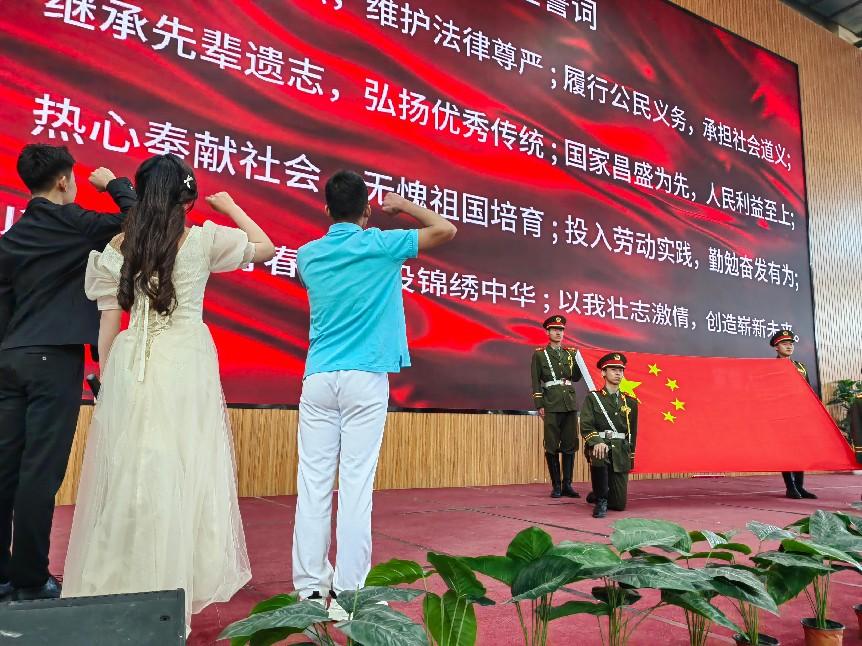 邓冠辉同学带领全体毕业生面向国旗庄严宣誓:“捍卫神圣宪法,维护法律尊严,履行公民义务!”......誓言铮铮,响彻云霄。