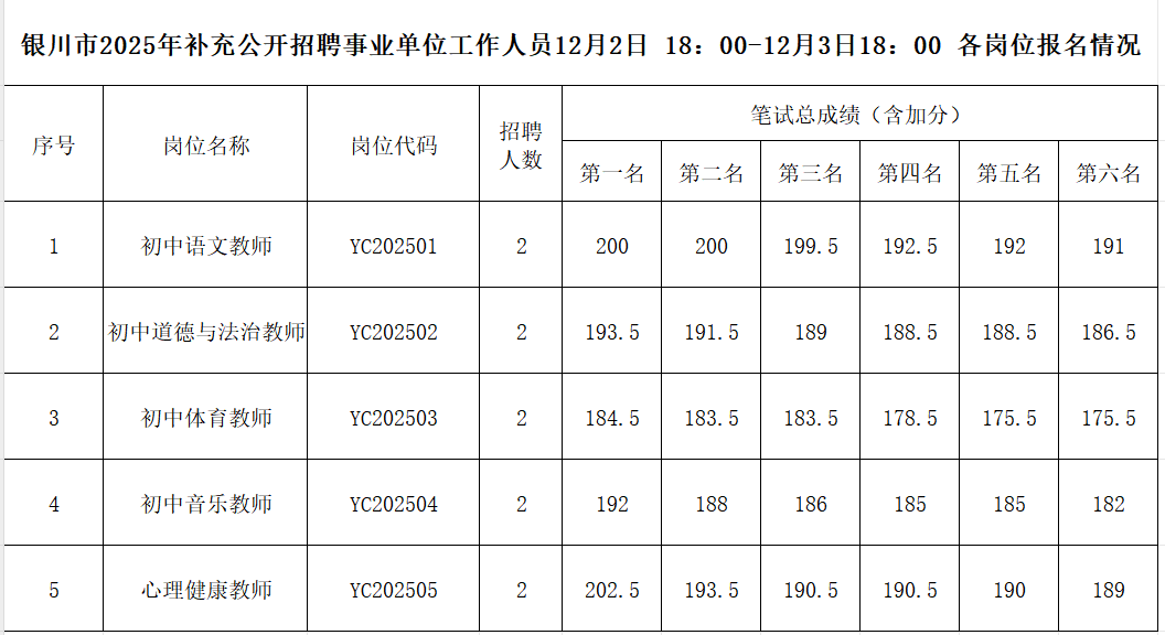 银川市2025年补充公开招聘事业单位工作人员12月2日18:00—12月3日18:00各岗位报名情况