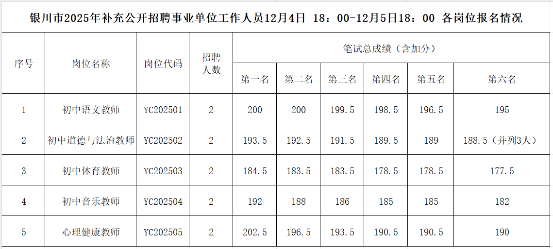 银川市2025年补充公开招聘事业单位工作人员12月4日18:00-12月5日18:00各岗位报名情况