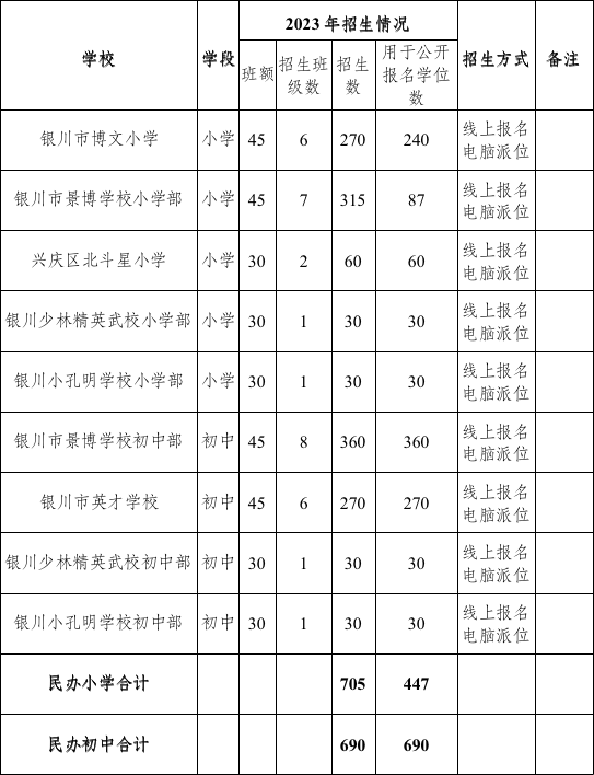 兴庆区2023年民办中小学招生计划