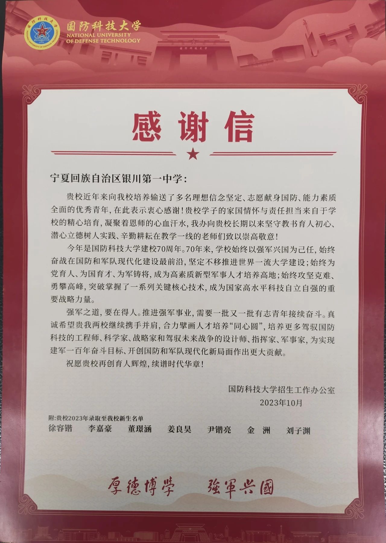 厚德博学,强军兴国。推进强军事业,需要一批又一批有志青年接续奋斗。银川一中将与国防科技大学继续携手并肩,合力擘画人才培养“同心圆”,培养更多驾驭国防科技的工程师、科学家、战略家和驾驭未来战争的设计师、指挥家、军事家,为实现建军一百年奋斗目标、开创国防和军队现代化新局面作出更大贡献。