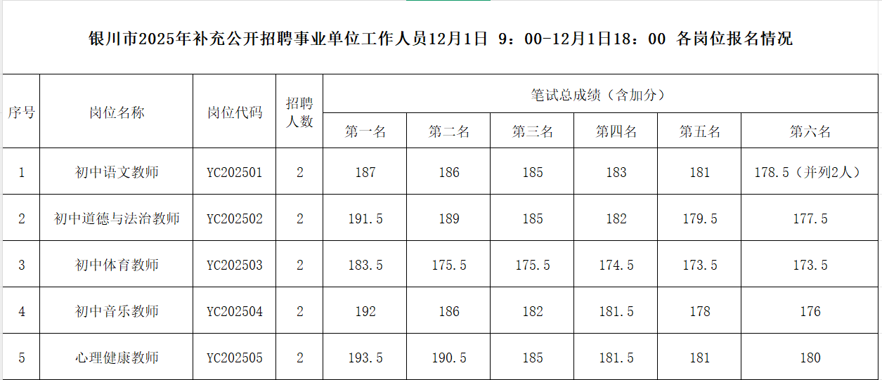 银川市2025年补充公开招聘事业单位工作人员12月1日9:00—12月1日18:00各岗位报名情况
