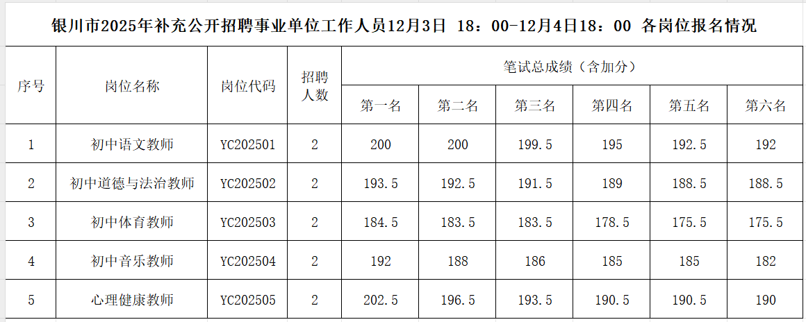 银川市2025年补充公开招聘事业单位工作人员12月3日18:00-12月4日18:00各岗位报名情况