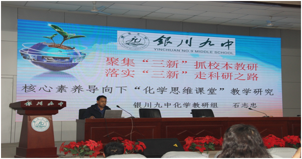 石志忠老师以《聚集“三新”抓校本教研,落实“三新”走科研之路》为题,分享了银川九中近两年课题申报与结题情况,并根据自己做课题的内容,对核心素养导向下的“化学思维课堂”教学研究进行了概念内涵解析、原理模型建构与成果展示。